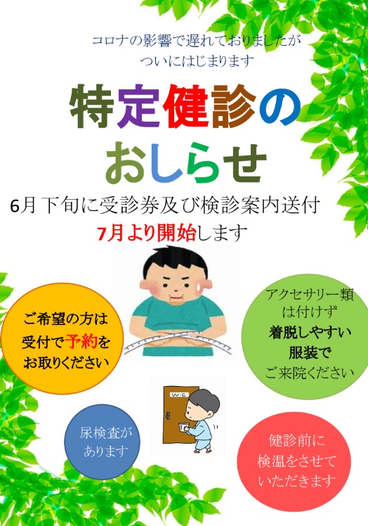 お知らせ INFORMATION 当院について 診療案内 医師紹介 お知らせ 結コラム 採用情報 お問い合わせ HOME お知らせ 特定健診開始のお知らせ 特定健診開始のお知らせ 2020年6月23日 お知らせ健康診断健診練馬区関町ゆいクリニック コロナ感染拡大に伴う影響で遅れておりましたが、6月下旬に健診案内・受診券が送付され、7月から開始となります。 関町ゆいクリニックでも健診の受付をしております。ご希望の方は、電話にて予約をお取りいただくとスムーズです。また、当日は着脱しやすい服装にてご来院ください。 当日は、健診前に検温をさせていただきます。 また、クリニック内にて採尿しますので、ご協力お願いいたします。 【新しいページへ】 【過去のページへ】 Twitter Facebook Pocket LINE